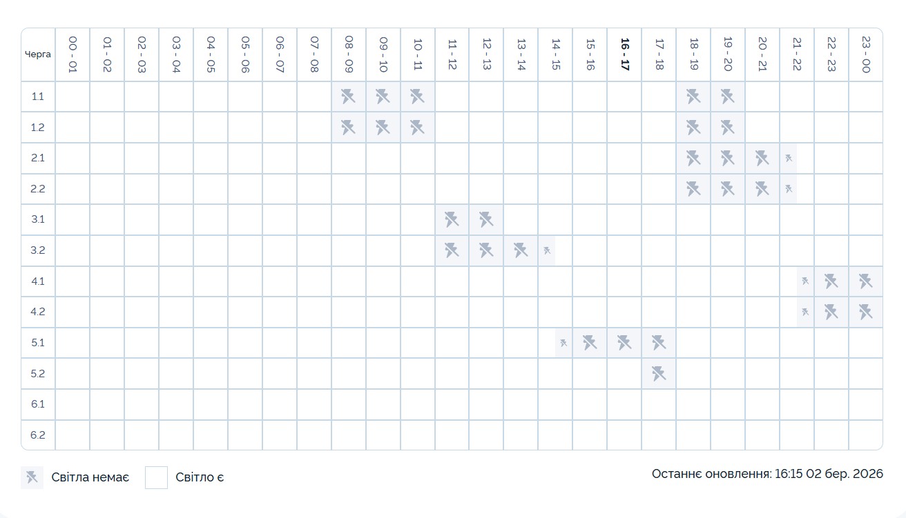 Зміни у графіках відключень на 2 березня (станом на 15:34):