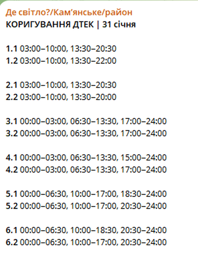 31 січня на Дніпропетровщині діють такі графіки: