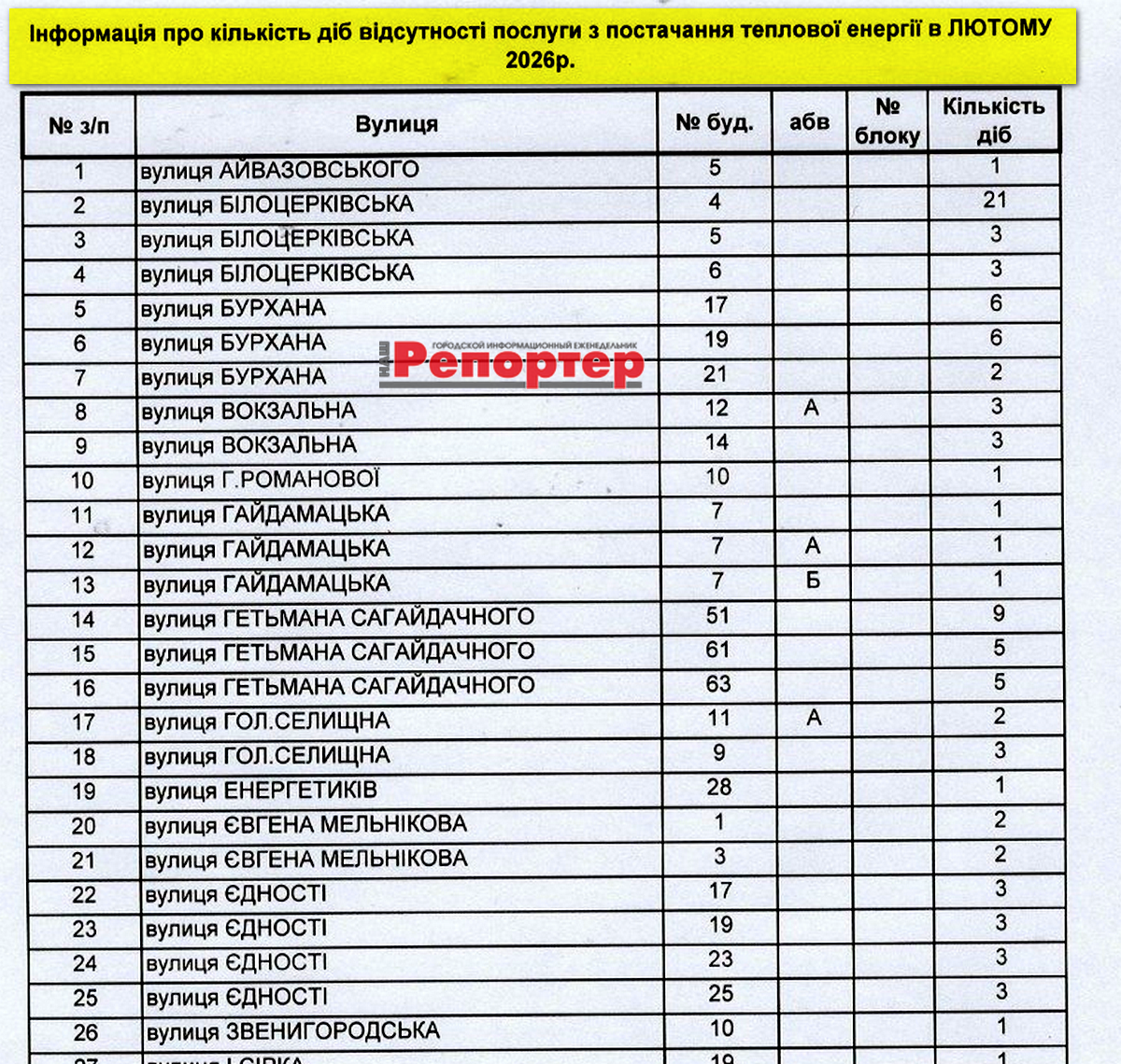4. «Дніпровська ТЕЦ» 8 квітня на сайті Кам’янської міської ради оприлюднила інформацію про будинки, де в лютому 2026 року не було опалення (на період доби і більше). На думку редакції, якось із запізненням надійшла ця інформація. Посилання – тут https://kam.gov.ua/ua/share-news/pg/30426164425180_p13/, список нижче на фото: