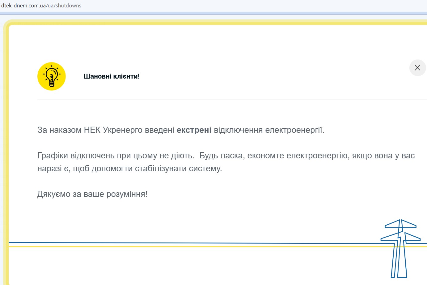 «Графіки відключень при цьому не діють. Будь ласка, економте електроенергію, якщо вона у вас наразі є, щоб допомогти стабілізувати систему.