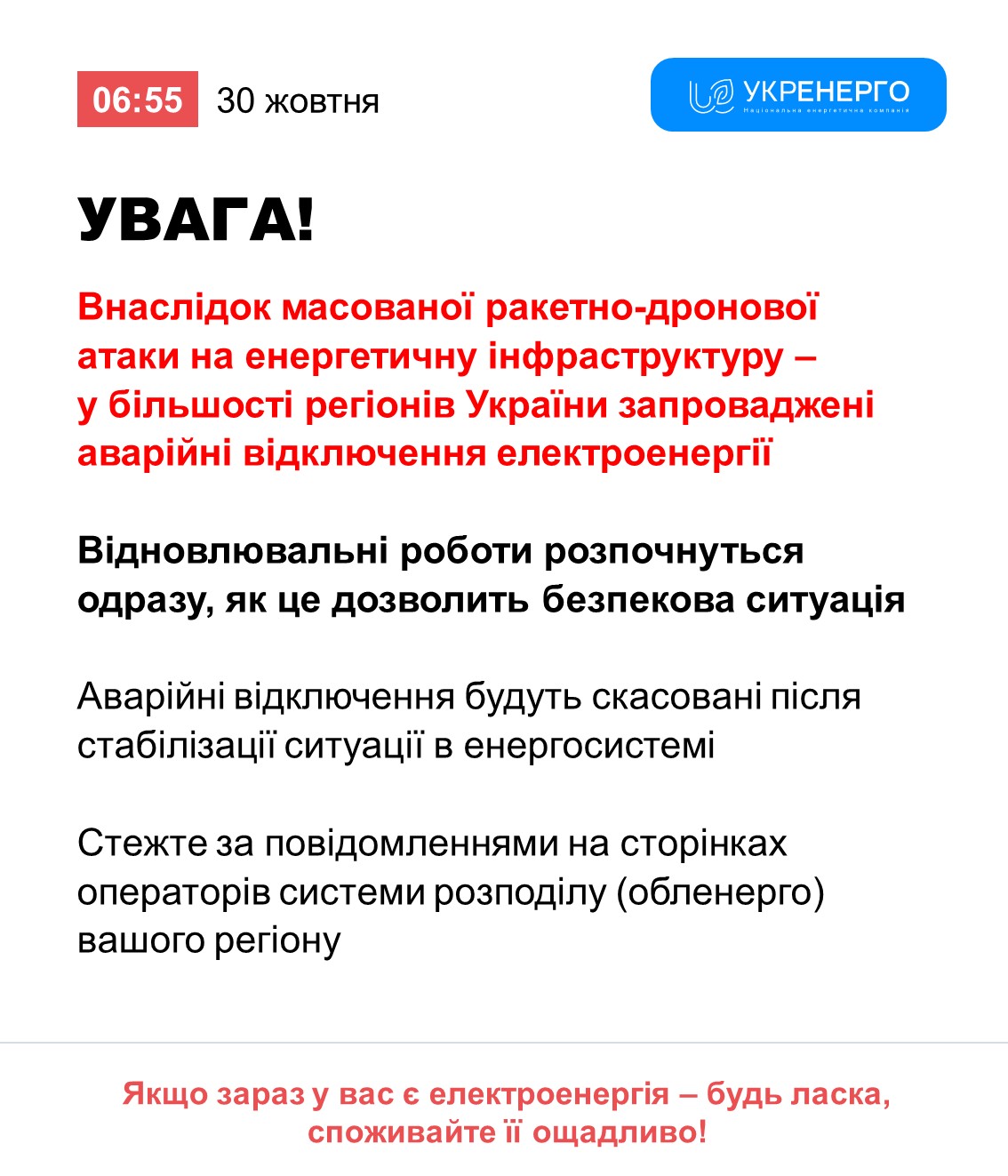 За наказом НЕК “Укренерго” вранці 30 жовтня у Дніпропетровській області введено екстрені відключення електроенергії.
