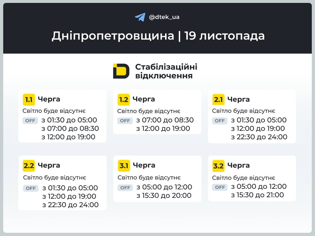 Про це повідомили у ДТЕК. У середу, 19 листопада, діють такі графіки відключень: