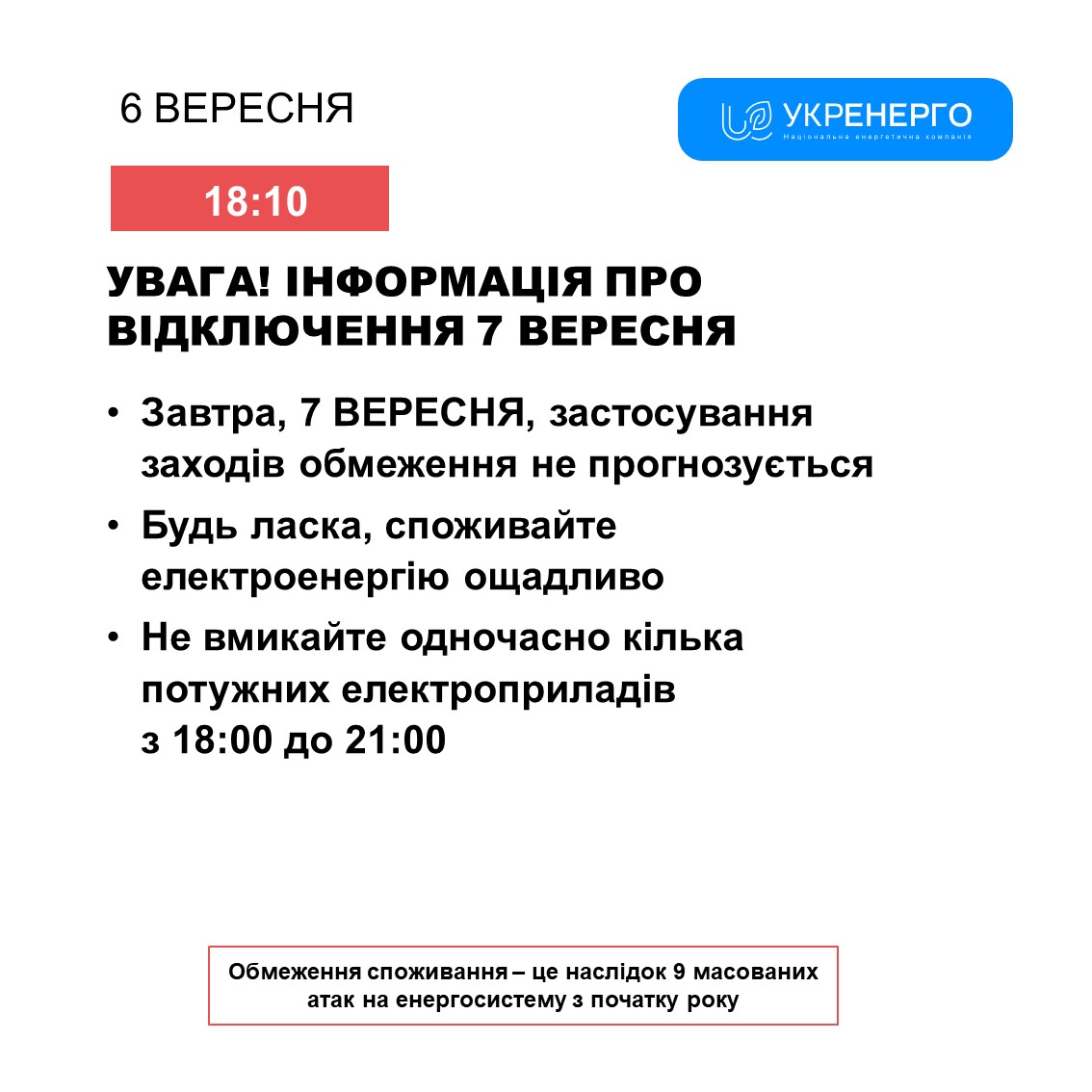 Відключення електроенергії 7 вересня не прогнозуються. Про це інформують в “Укренерго”.
