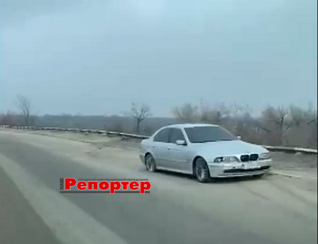 На фото від наших читачів траса на Новому мосту. БМВ розвернуло проти руху, поряд з авто видно сліди різкого віражу. Судячи зі світлини, пошкоджено заднє колесо. Але могло бути й гірше.