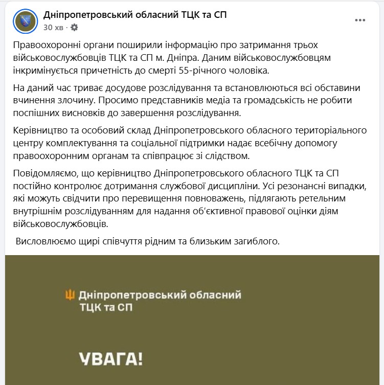 “Правоохоронні органи поширили інформацію про затримання трьох військовослужбовців ТЦК та СП м. Дніпра. Даним військовослужбовцям інкримінується причетність до смерті 55-річного чоловіка.