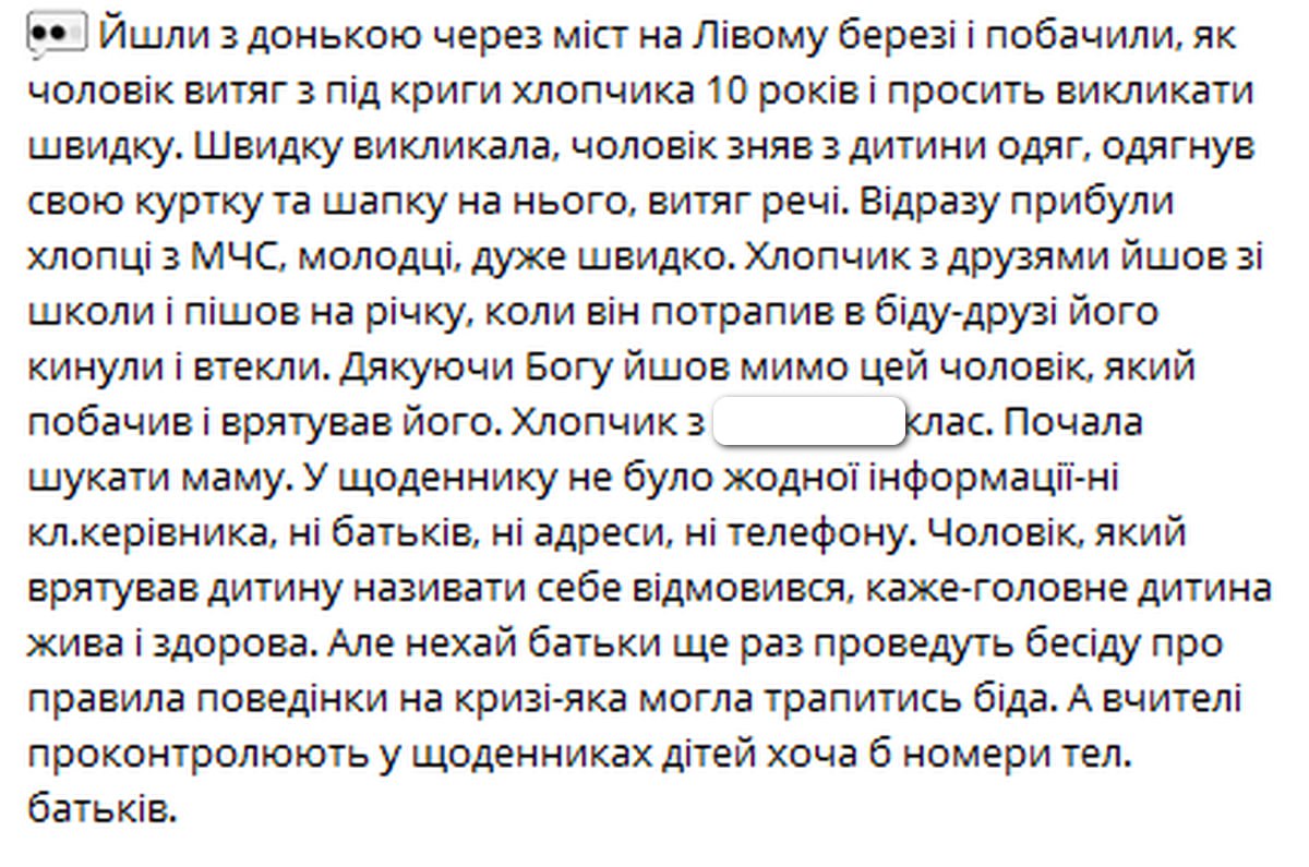 P. S. Дякувати Богу, що все обійшлося саме так. При цьому, хоч морози і спадають, крига, як і раніше, на всіх водоймах. Публікуємо цю історію також і для того, щоб дорослі поговорили з дітьми на цю тему, та й самі були розсудливими. Лід помилок не вибачає. А такі рішучі люди, як чоловік, який врятував хлопчика, виявляються поруч, на жаль, не завжди…