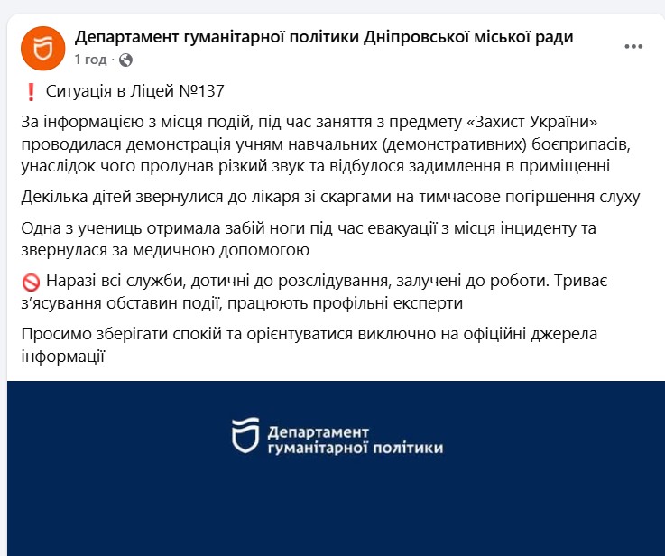 “За інформацією з місця подій, під час заняття з предмету «Захист України» проводилася демонстрація учням навчальних (демонстраційних) боєприпасів, унаслідок чого пролунав різкий звук та відбулося задимлення в приміщенні