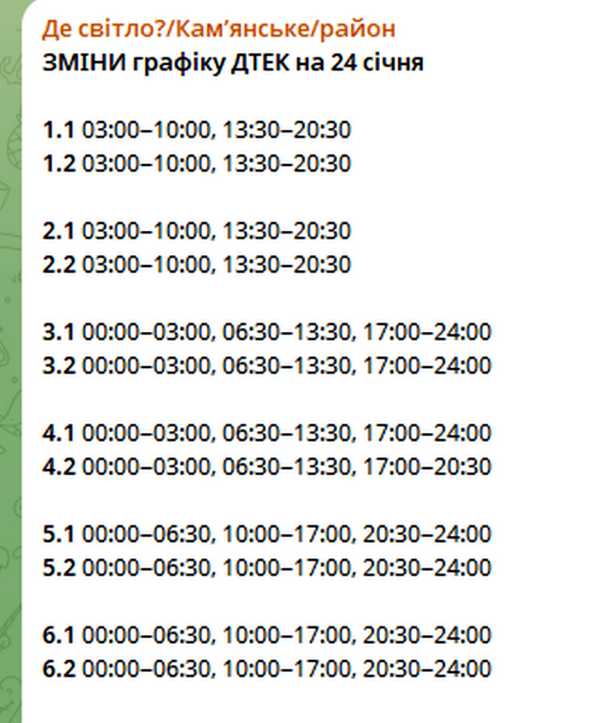 На утро 24 января действуют такие изменения в графике (источник – https://t.me/svet_kamenskoe/1354)