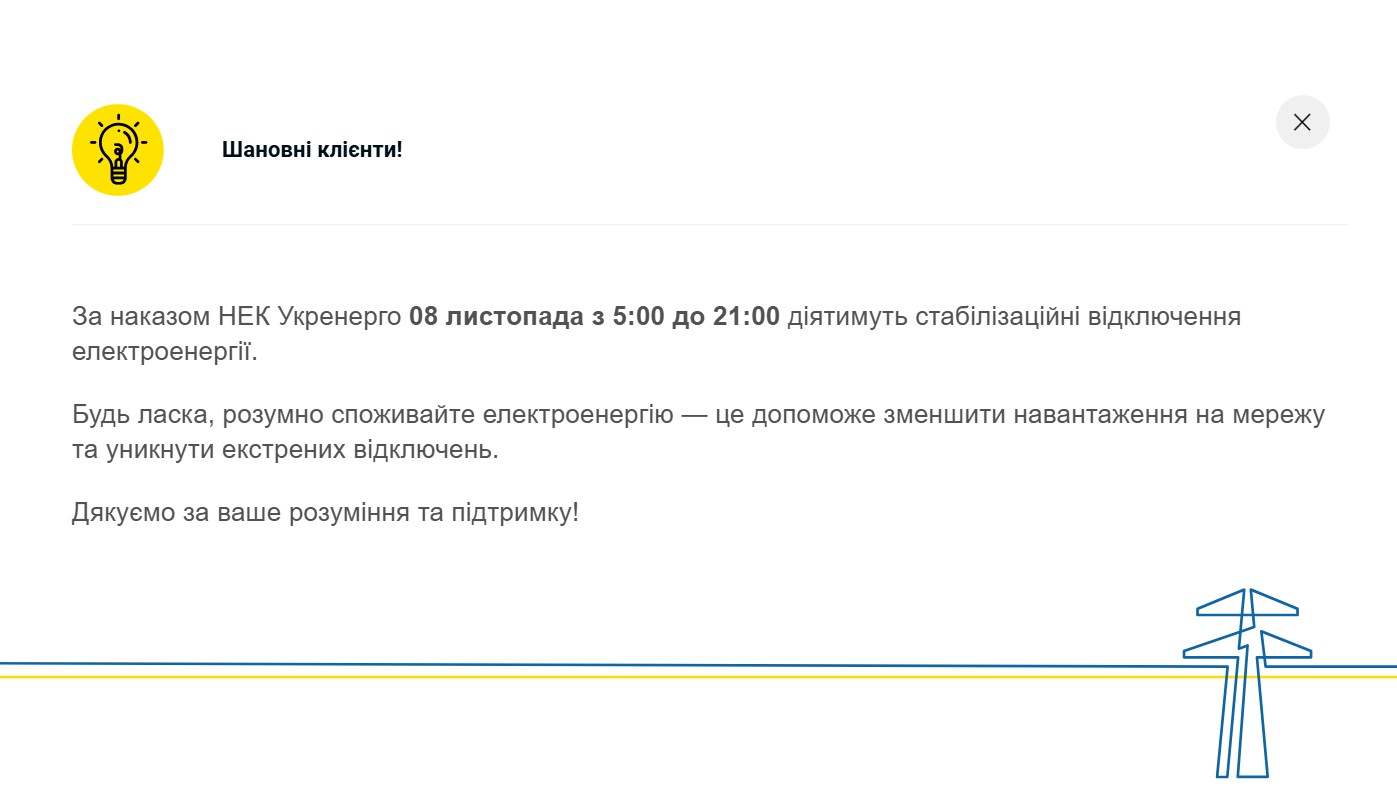 Сообщение в 11:35: “АТ “ДТЕК Дніпровські електромережі” повідомляє: згідно з графіком погодинного відключення, тимчасово частково знеструмлені споживачі району Черемушки, центральної частини міста, вул. М. Чиженка, вул. Є. Мельнікова та прилеглі вулиці”.