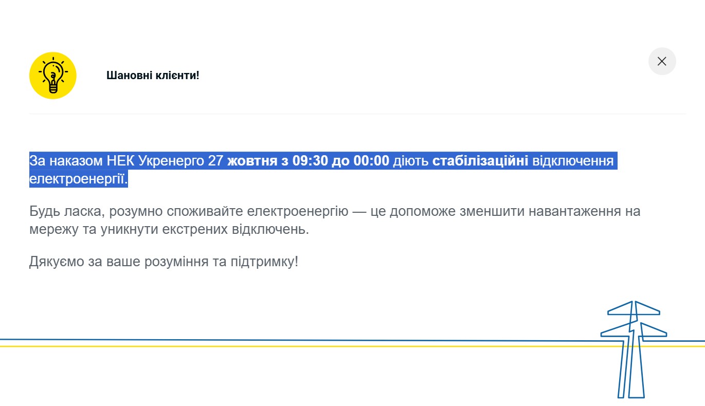 Сообщение в 11:20: “АТ «ДТЕК Дніпровські електромережі» повідомляє: згідно з графіком погодинного відключення, тимчасово частково знеструмлені споживачі районів “Черемушки”, центральної частини міста, вул. М. Чиженка, вул. Є. Мельнікова та прилеглі вулиці”.