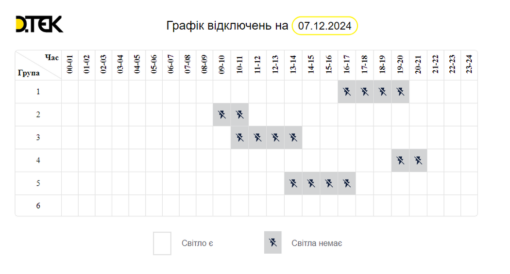 Согласно информации на сайте ДТЭК “Днепровские электросети”, 7 декабря будет действовать такой график отключения: