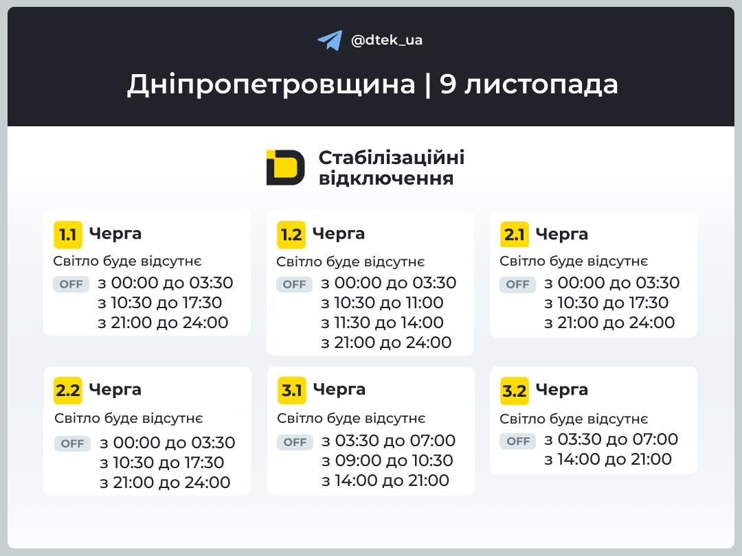 Согласно информации ДТЭК, на Днепропетровщине будут действовать следующие графики: