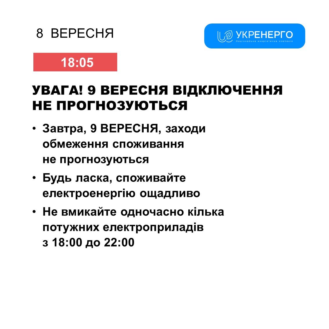 В понедельник, 9 сентября, стабилизационные отключения не прогнозируются, информируют в “Укрэнерго”.