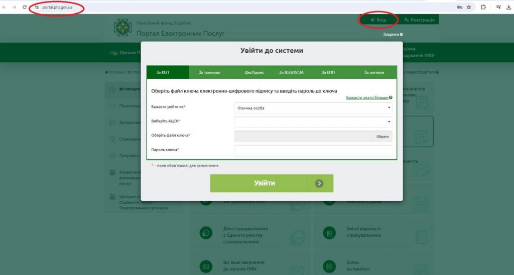 - На веб-портале ПФУ (portal.pfu.gov.ua) в правом верхнем углу экрана нажмите кнопку “Вхід” и авторизуйтесь с помощью квалифицированной электронной подписи (КЭП), “Дія. Підпис” или ID.GOV.UA.