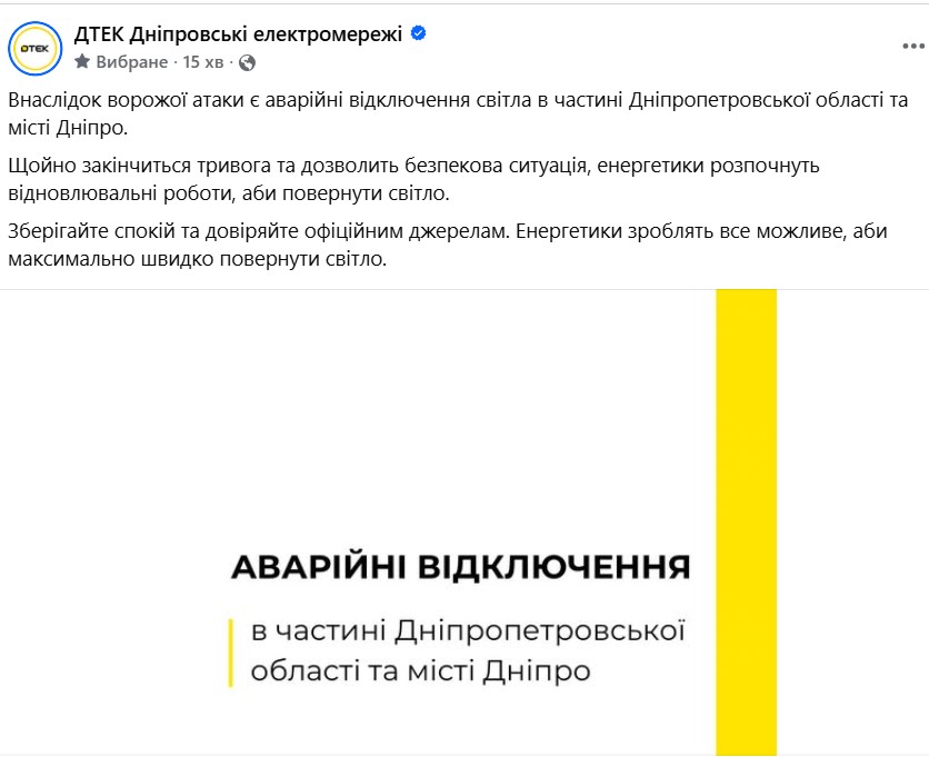 В результате вражеской атаки действуют аварийные отключения света в части Днепропетровской области и городе Днепр.