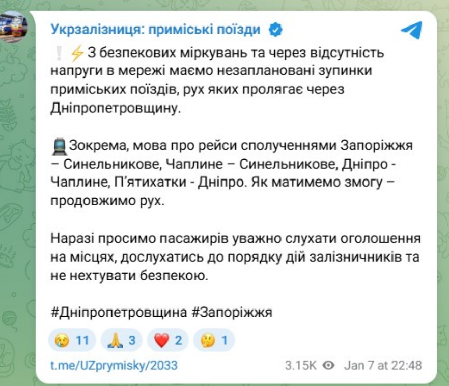 Из соображений безопасности и из-за отсутствия напряжения в сети произошли незапланированные остановки пригородных поездов, маршрут которых пролегает через Днепропетровщину. Об этом сообщили в АО «Укрзалізниця».
