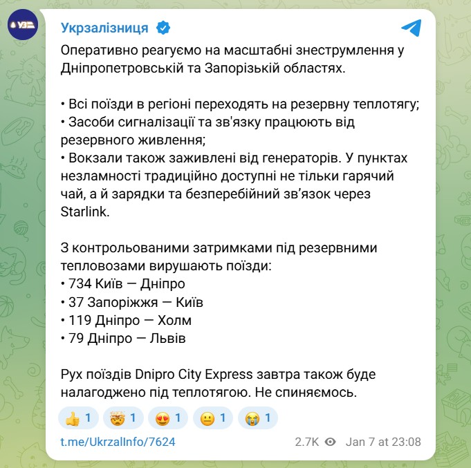 Как только закончится тревога и позволит ситуация с безопасностью, энергетики начнут восстановительные работы, чтобы вернуть электроэнергию. Об этом поздно вечером 7 января сообщили на официальной фейсбук-странице ДТЭК «Днепровские электросети».