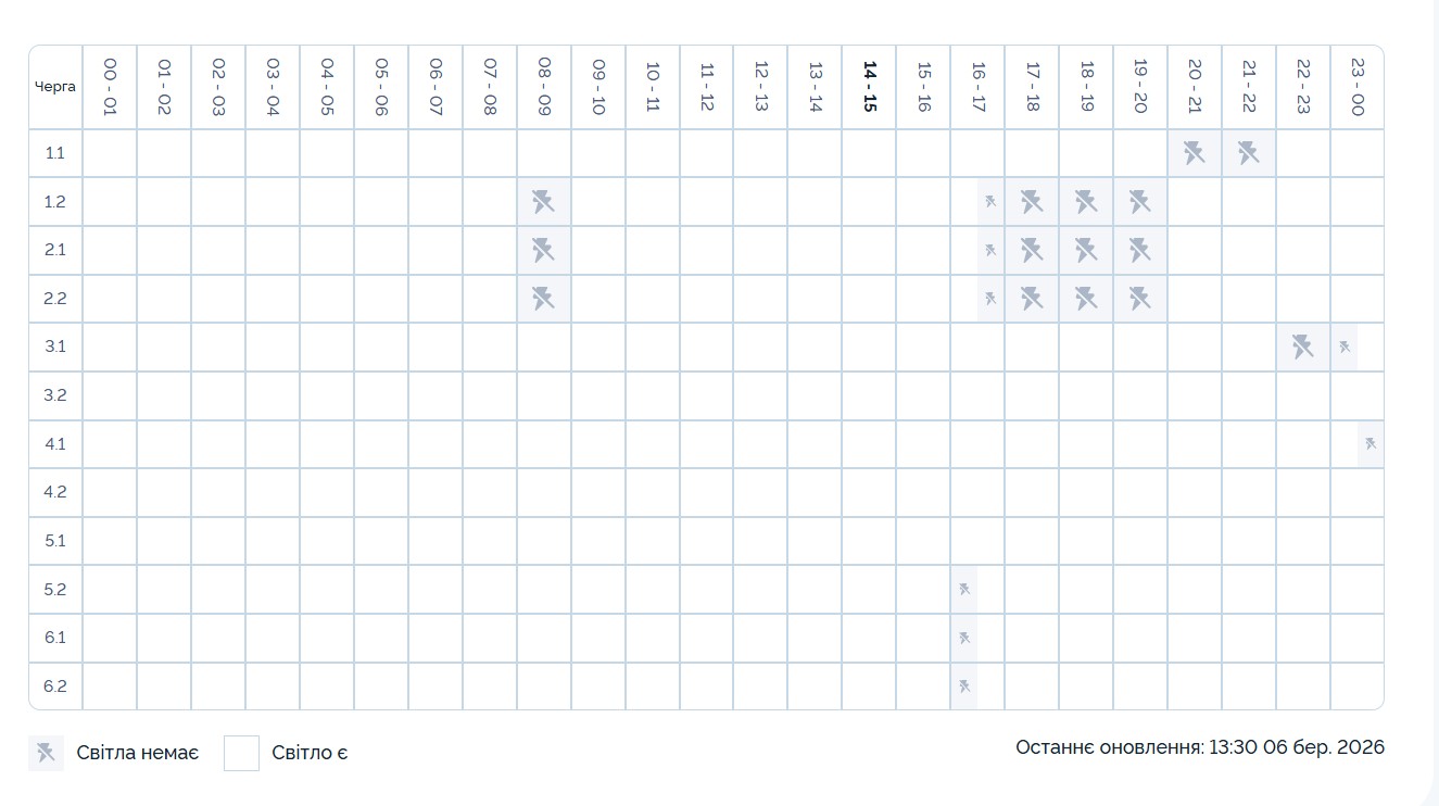 В части регионов Украины 6 марта применяются графики почасовых отключений света. Об этом сообщили в “Укрэнерго”.