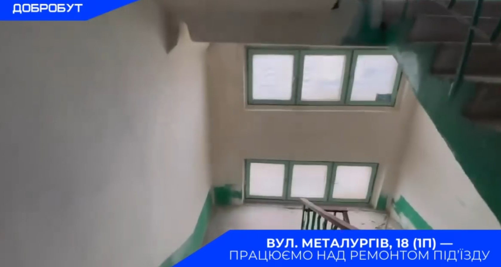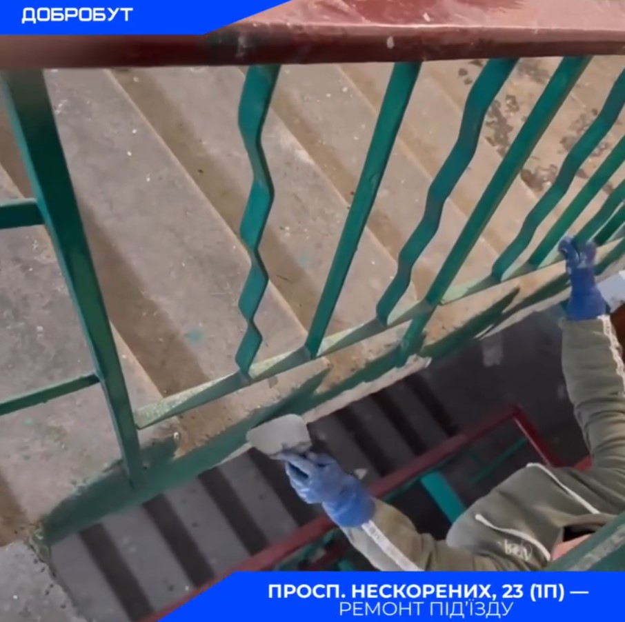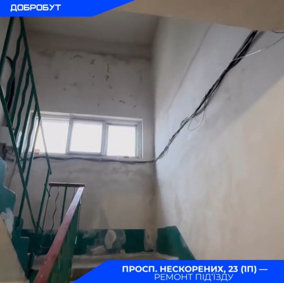 Рабочие ремонтируют первый подъезд на пр. Нескорених (Победы), 23.