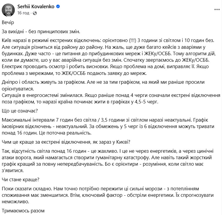 Максимальные интервалы «7 часов без света / 3,5 часа со светом» больше не актуальны. Также график вероятных отключений в прежнем виде не работает. При условии 5 очередей из 6 отключения электроэнергии могут длиться более 16 часов в сутки. Это текущая реальность энергосистемы, информирует Коваленко.
