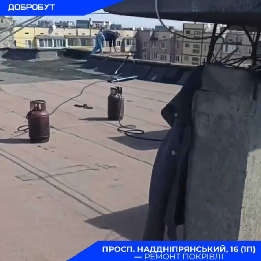 Продолжается ремонт кровли в первом подъезде дома на пр. Надднепрянском, 16.