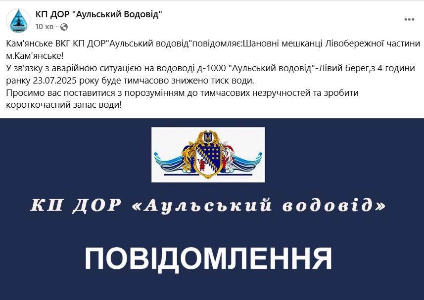 В среду, 23 июля, с 4:00 утра будет временно снижено давление воды. Об этом сообщили на КП ДОР “Аульский водовод”.
