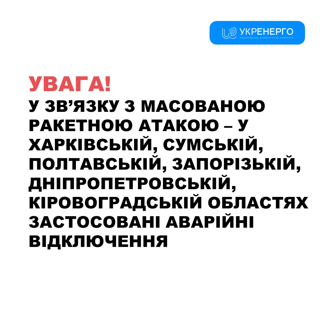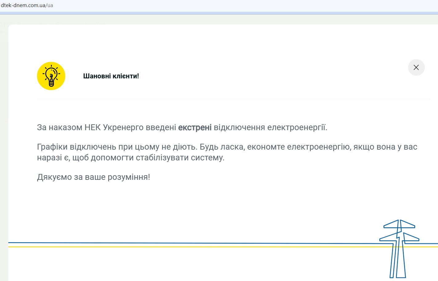 “Графіки відключень при цьому не діють. Будь ласка, економте електроенергію, якщо вона у вас наразі є, щоб допомогти стабілізувати систему.