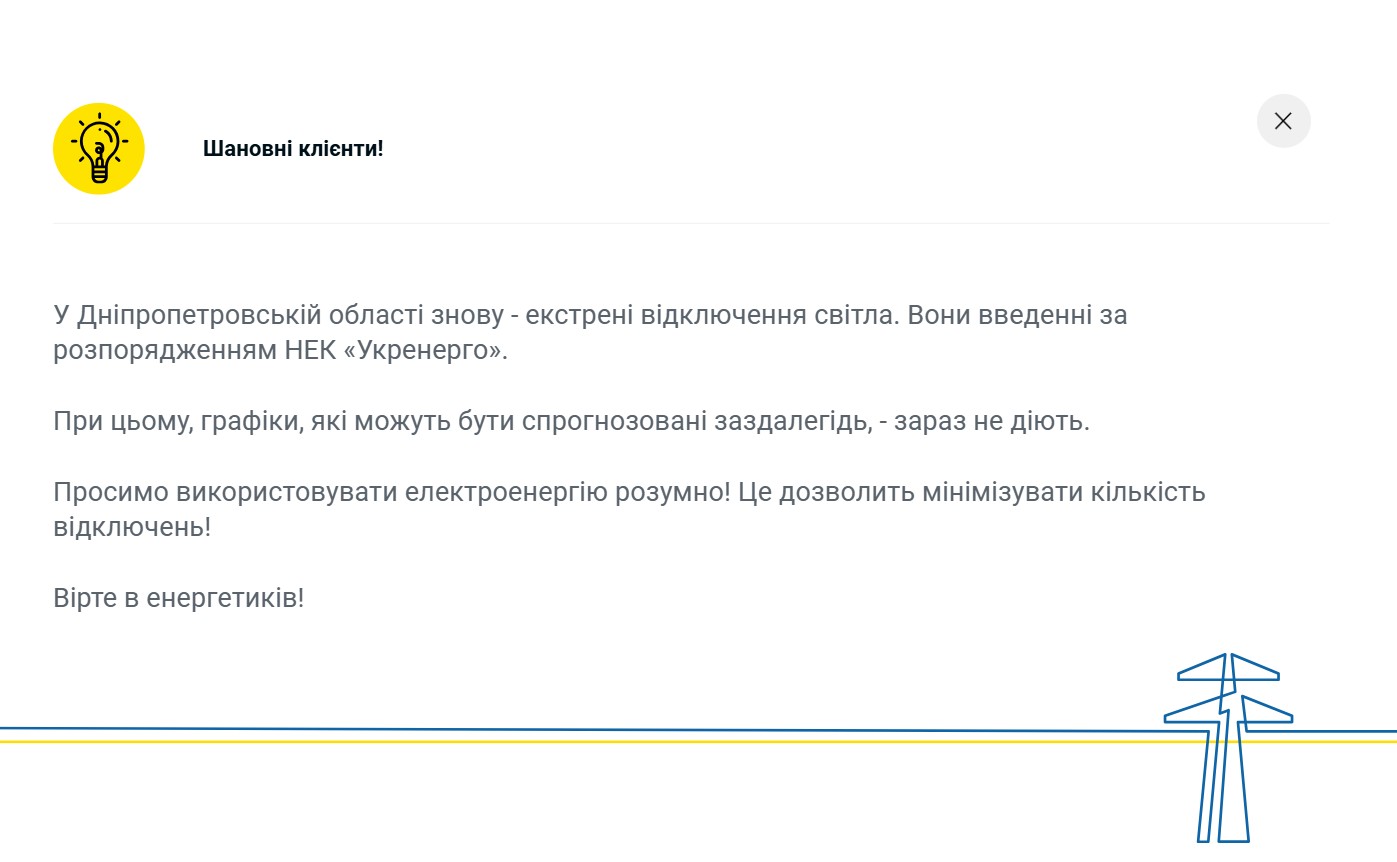Жителям Каменского: 27 октября на Днепропетровщине применены экстренные отключения света (обновляется)