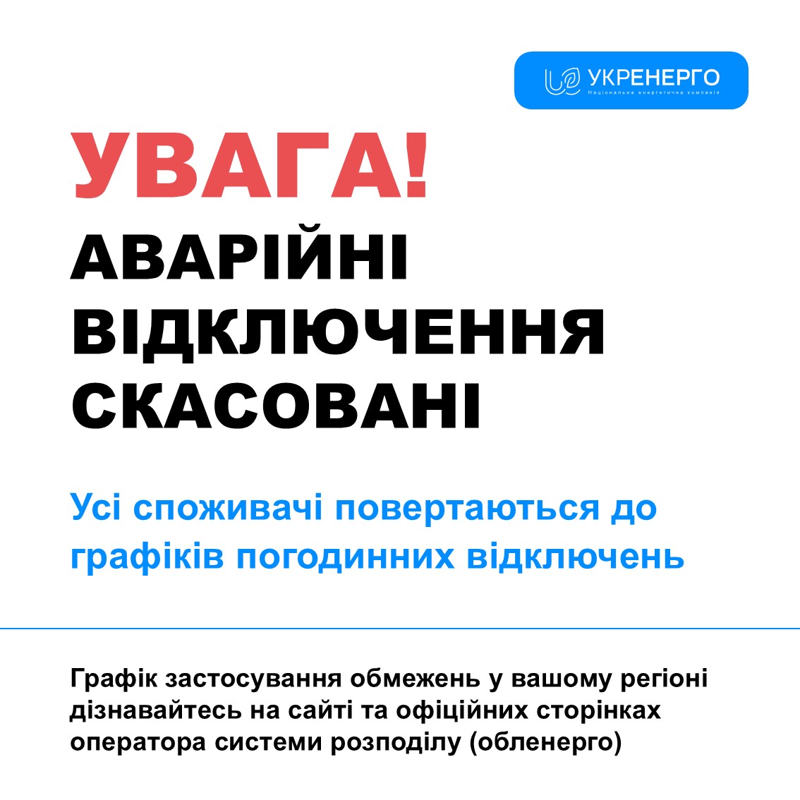 По команде “Укрэнерго” (информация по состоянию на 12:00) аварийные отключения отменены. Все потребители возвращаются к графикам почасовых отключений.