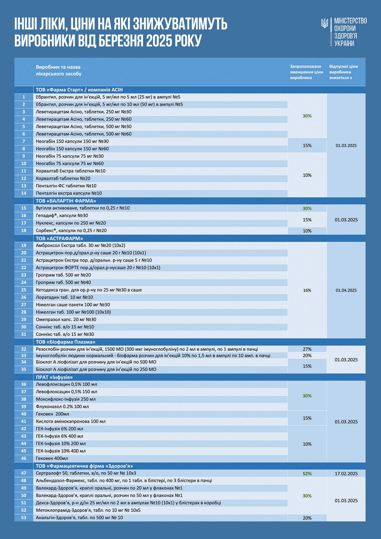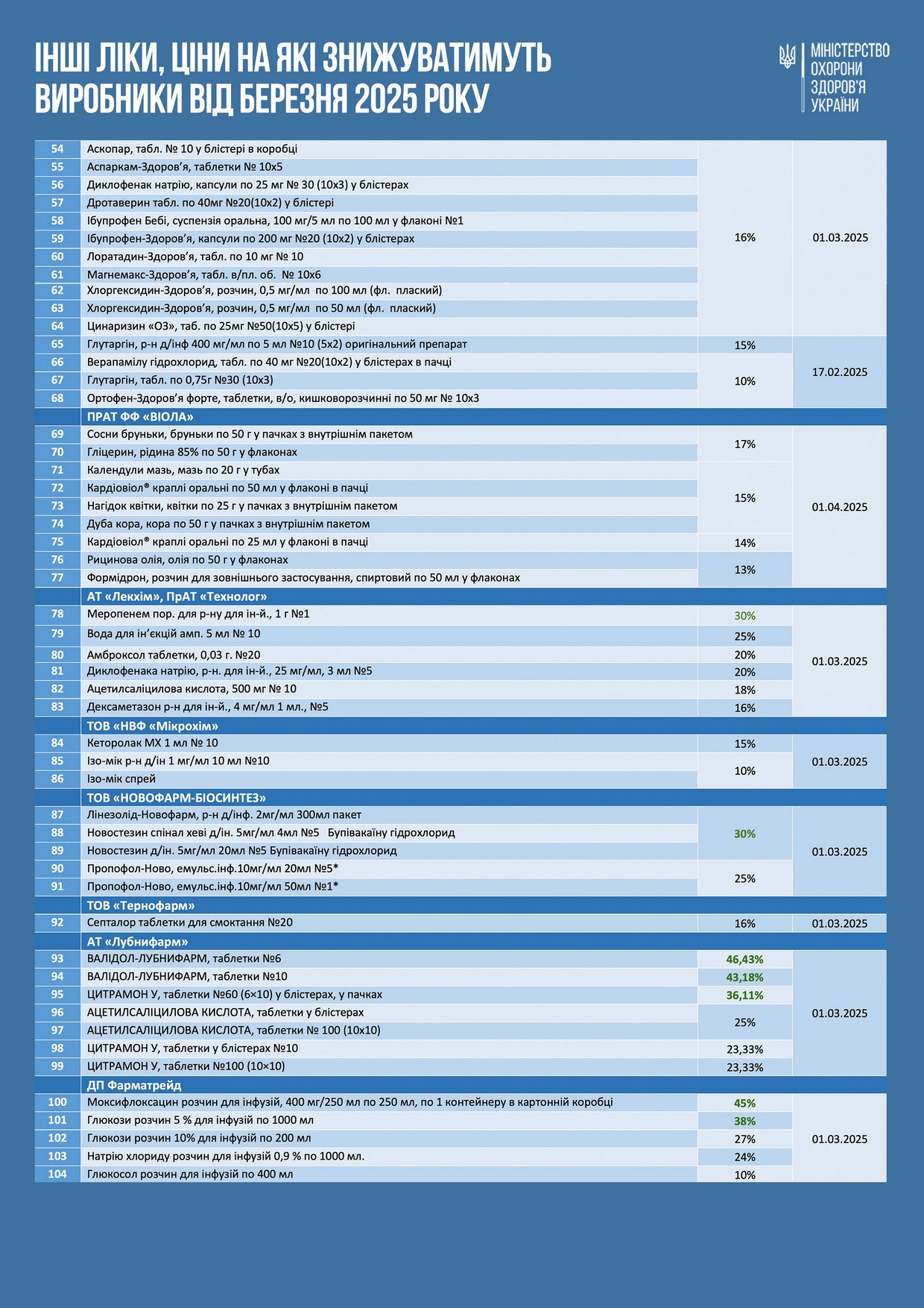 Это результат встречи министра Виктора Ляшко с представителями украинских производителей фармпродукции, которая состоялась на минувшей неделе в Минздраве. Участники встречи обсудили реализацию согласованного пошагового плана для дальнейшего снижения цен на лекарства, не входящие в список 100 медикаментов (подробнее – по ссылке). В частности, речь шла и о том, что производители обработают и предоставят министерству перечень лекарств собственного производства, цены на которые вскоре могут быть снижены для конечного потребителя.