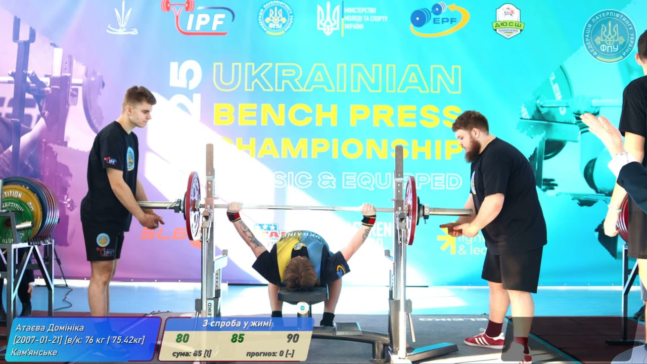 Кам’янчанка стартувала із ваги, яку багато хто з дівчат замовляв у останній третій спробі. Легко та витончено взявши 80 кг та 85 кг, Домініка Атаєва наостанок підійшла до ваги у 90 кг, які давно долає на тренуваннях. Але офіційний виступ – це не тренування. Напруження – неймовірне. Результат більше був потрібен не стільки для перемоги в своїй ваговій категорії до 76 кг. Вдала остання спроба спортсменки дитячо-юнацької спортивної школи №2 КМР принесла Кам’янському першу абсолютну медаль цього чемпіонату, ще й золоту. Слід пам’ятати, що в абсолютному заліку враховуються результати всіх дівчат, які виступали в різних вагових категоріях. Визначення трьох кращих відбувається за сумою IPF, котра розраховується суддями за спеціальною формулою. Зафіксувавши у третій спробі вагу штанги 90 кг, кандидатка у майстри спорту Д. Атаєва стала найсильнішою українкою серед 35 конкуренток цієї вікової групи! Вітаємо та дякуємо за суперрезультат!