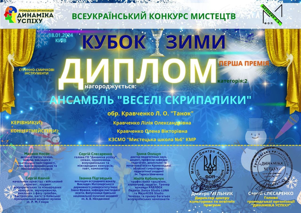 Также дипломом I степени наградили “Веселих скрипаликів” за участие во Всеукраинском конкурсе искусств “Кубок зими”, который проходил 18 января в Киеве. Благодарностями были отмечены руководитель ансамбля скрипачей Лилия Кравченко и концертмейстер Елена Кравченко.