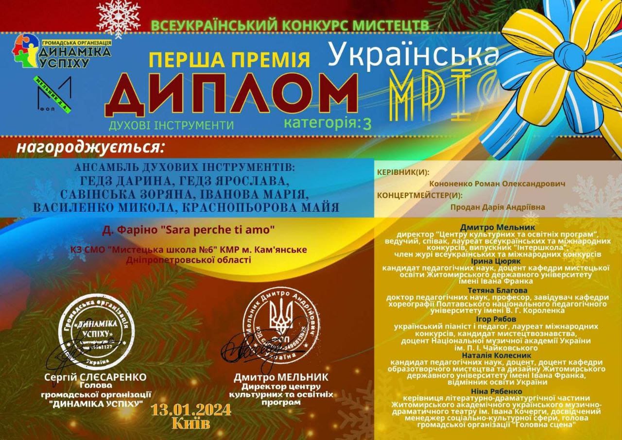 Дипломом I степени награжден ансамбль духовых инструментов Jump (Дарина Гедз, Ярослава Гедз, Зоряна Савинская, Мария Иванова, Николай Василенко и Майя Красноперова), который принял участие во Всеукраинском конкурсе искусств “Українська мрія”. Мероприятие прошло 13 января в Киеве. Руководитель ансамбля Jump Роман Кононенко и концертмейстер Дарья Продан получили от организаторов благодарности.