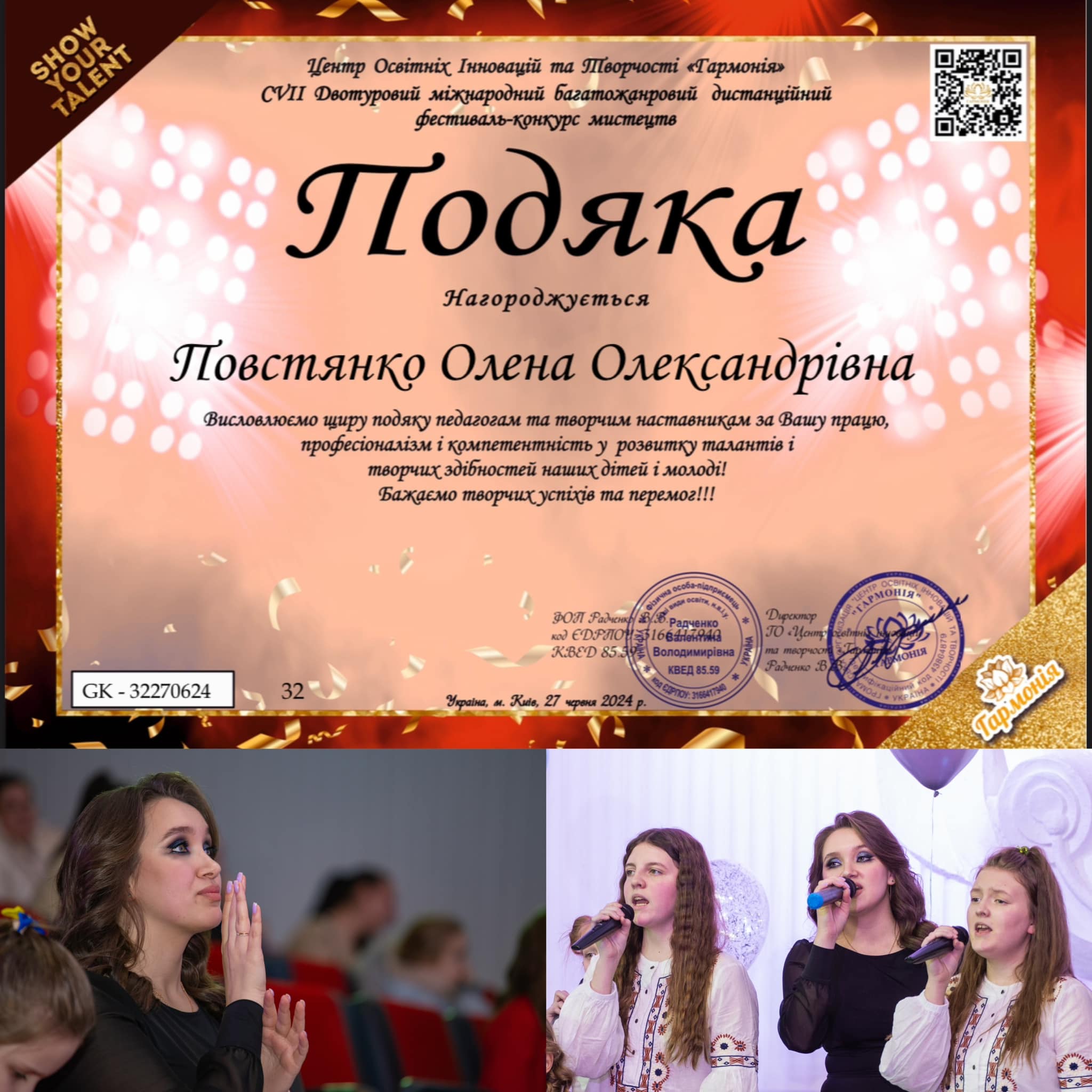 Преподаватель и творческий наставник вокалистов Елена Повстянко получила благодарность за труд, профессионализм и компетентность в развитии талантов творческих способностей детей и молодежи.