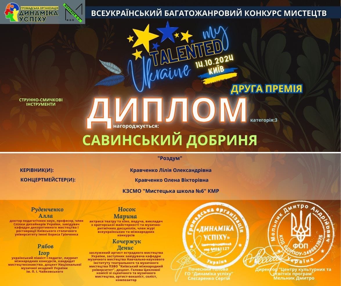 - Добрыня Савинский сыграл музыкальное произведение “Роздум” и был отмечен дипломом II премии (преподаватель Лилия Кравченко, концертмейстер Елена Кравченко), номинация (“Струнно-смычковые инструменты”).
