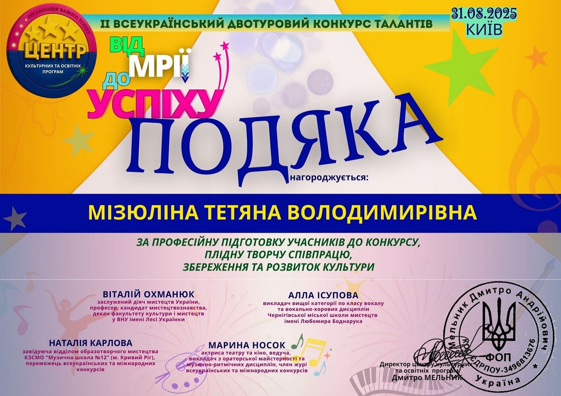 Татьяна Мизюлина получила от организаторов благодарность за профессиональную подготовку участников к конкурсу, плодотворное творческое сотрудничество, сохранение и развитие культуры.