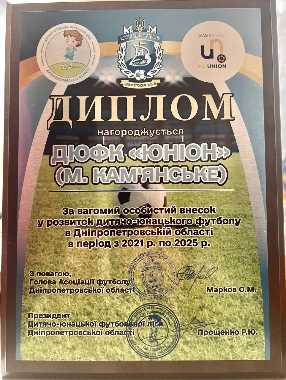 Детско-юношеский футбольный клуб “Юнион” из Каменского получил почетный диплом АФДО за весомый вклад в развитие детско-юношеского футбола в регионе. Эта награда подчеркивает системную и последовательную работу клуба, направленную на воспитание юных спортсменов и популяризацию футбола среди детей.