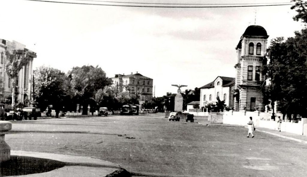 Примечательно, что во время фашистской оккупации (август 1941 – октябрь 1943). Упомянутое здание своего назначение не изменило, в нем продолжали работать городские, теперь уже оккупационные власти. Вот только площадь стала называться по-другому. Около месяца она носила имя немецкого вождя Адольфа Гитлера, а после – стала Театральной. Кстати, на пьедестале монумента, на котором находился памятник Ленину, установили орла с нацистской свастикой.