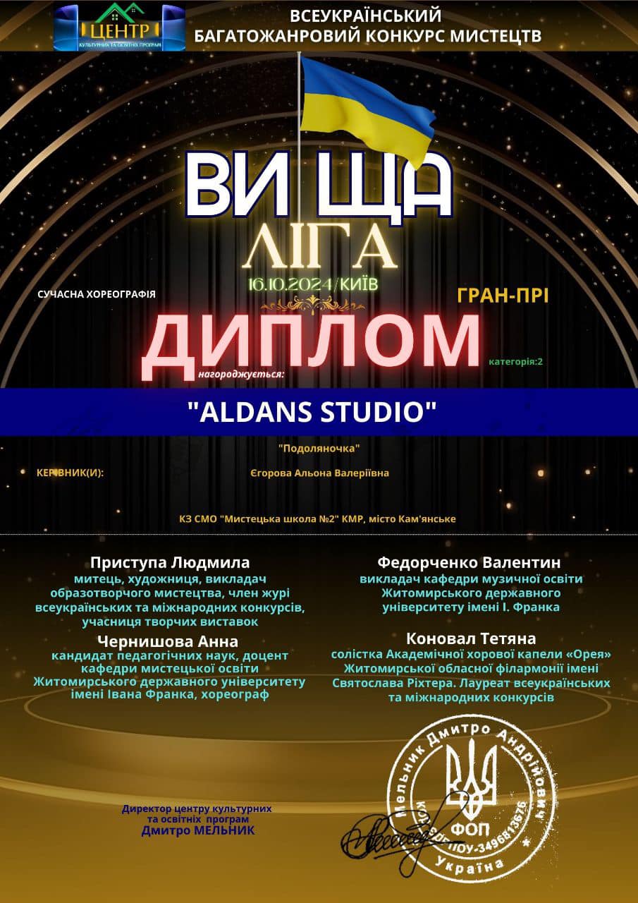 Ученики IV класса хореографического отделения приняли участие в номинации “Современная хореография”. Детский коллектив Aldans Studio был отмечен Гран-при (высшей наградой) за композицию “Подолянка”.