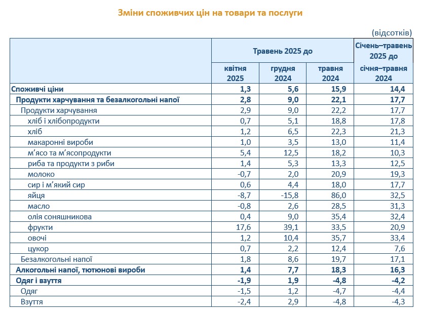По информации Госстата, на потребительском рынке в мае цены на продукты питания и безалкогольные напитки выросли на 2,8%. Особенно выделяются фрукты, цена на которые взлетела на 17,6%. Также выросли цены на свинину, мясо птицы, говядину, безалкогольные напитки, рыбу, хлеб, сало, овощи, макаронные изделия и сахар (рост от 0,7% до 8,3%). Однако яйца подешевели на 8,7%, а цены на масло, молоко и рис снизились на 0,5-0,8%.