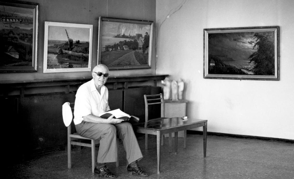 На фото – Анатолий Кальянов, бывший директор школы №9 (и выпускник художественной академии), в выставочном зале, 1984 год