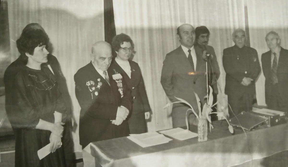 Фотография с открытия выставки. Слева направо: Н. Цыганок, директор музея истории Днепродзержинска; А. Грабовский, защитник города в 1941 г.; А. Конельская, заместитель председателя исполкома горсовета; А. Жежор, художник; Г. Хачатрян, скульптор; И. Першудчев; скульптор, Д. Кичко, художник