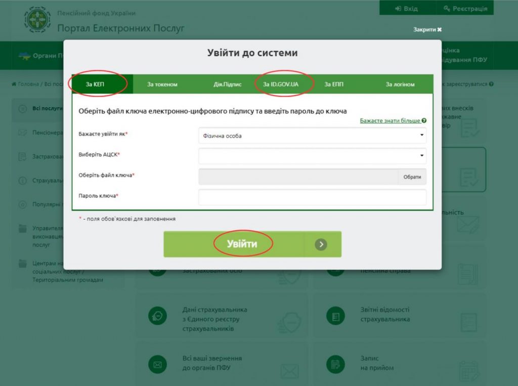 1. Авторизуйтесь в личном кабинете электронных услуг ПФУ с помощью квалифицированной электронной подписи (КЭП) или интегрированной системы электронной идентификации (ID.GOV.UA) и нажмите кнопку «Увійти».