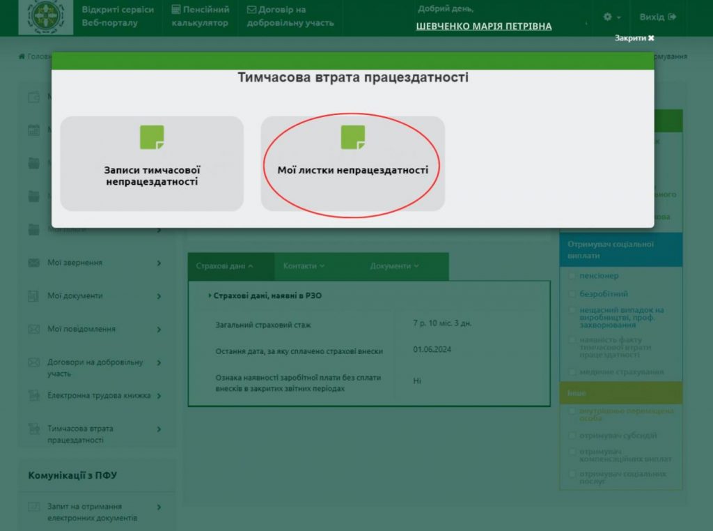 3. Выделите раздел «Мої листки непрацездатності».