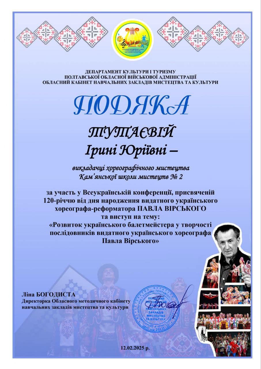 - преподаватель хореографического искусства Ирина Юрьевна Тутаева – тема: “Розвиток українського балетмейстерства у творчості послідовників видатного українського хореографа Павла Вірського”.