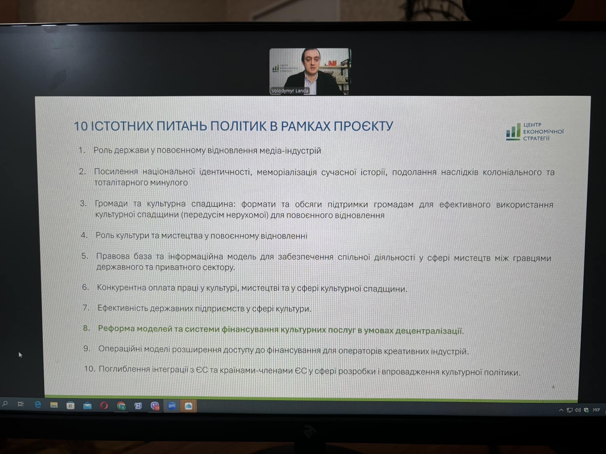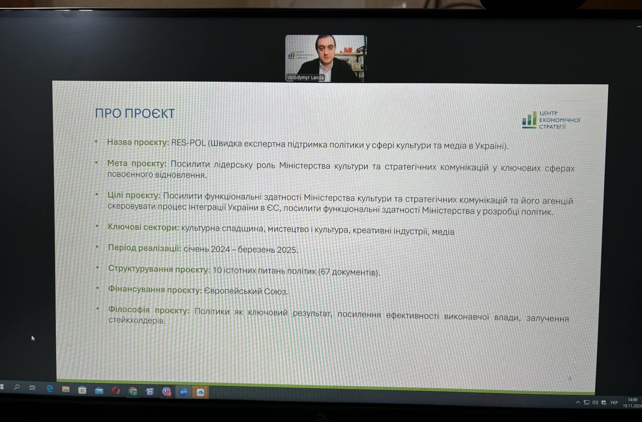 Мероприятие прошло 19 ноября в дистанционном формате. Его организовали Центр экономической стратегии и Министерство культуры и стратегических коммуникаций. Ведущие специалисты ЦЭС представили предварительные выводы о финансировании культурных услуг в условиях децентрализации, которые были собраны во время проведения интервью с деятелями культуры. Мероприятие было разделено на три тематических блока: