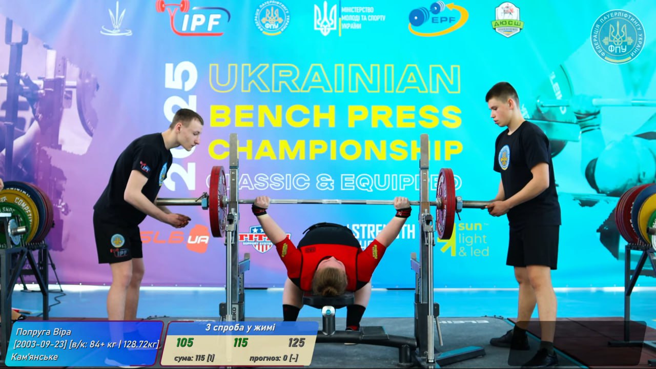 Якось легко, а ми пам’ятаємо про травму плеча, виступила Віра Попруга, яка прогресує семимильними кроками саме у жимі лежачи. Той, хто аналізував її виступ місячної давнини на ЧУ з триборства, пам’ятає, що дівчина встановила новий рекорд України, який був недосяжним для будь-якої юніорки нашої країни з моменту “народження” вагової категорії 84+ кг. Тоді на штанзі було 117,5 кг. Цього ж разу у третій спробі асистенти встановили вагу 125 кг, яка не є рекордною в окремому виді пауерліфтингу – жимі штанги лежачи, але є особистим кращим результатом спортсменки на всеукраїнських та міжнародних офіційних змаганнях. Кам’янчанка впевнено та з запасом зробила цей результат, здолавши опір конкуренток та виборовши чергове золото! Для любителів статистики слід зазначити, що такі ж вдалі спроби від атлетки судді та глядачі побачили у двох перших спробах – 105 кг та 115 кг.