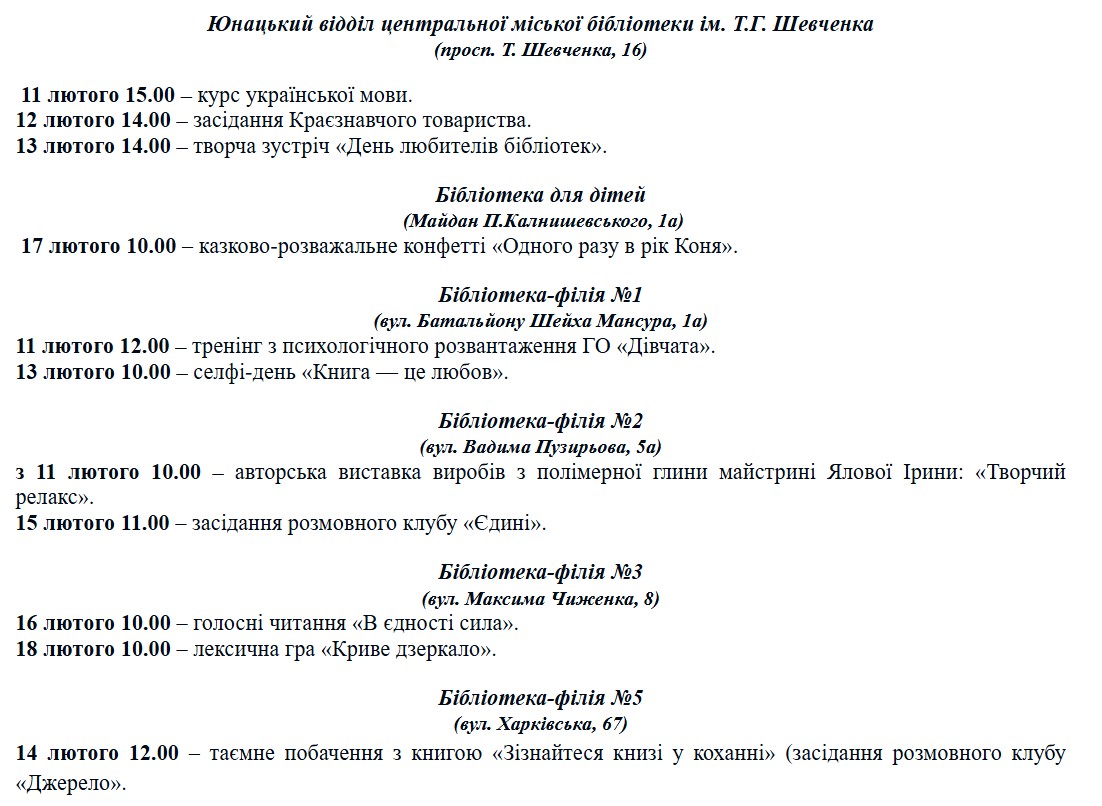 Центральная библиотека им. Т. Шевченко приглашает на художественные выставки, уроки рисования, курсы английского, беседу с психологом и творческие мероприятия. В библиотеках-филиалах города пройдут заседания языкового клуба, краеведческого общества, творческая встреча, авторская выставка и т. д.