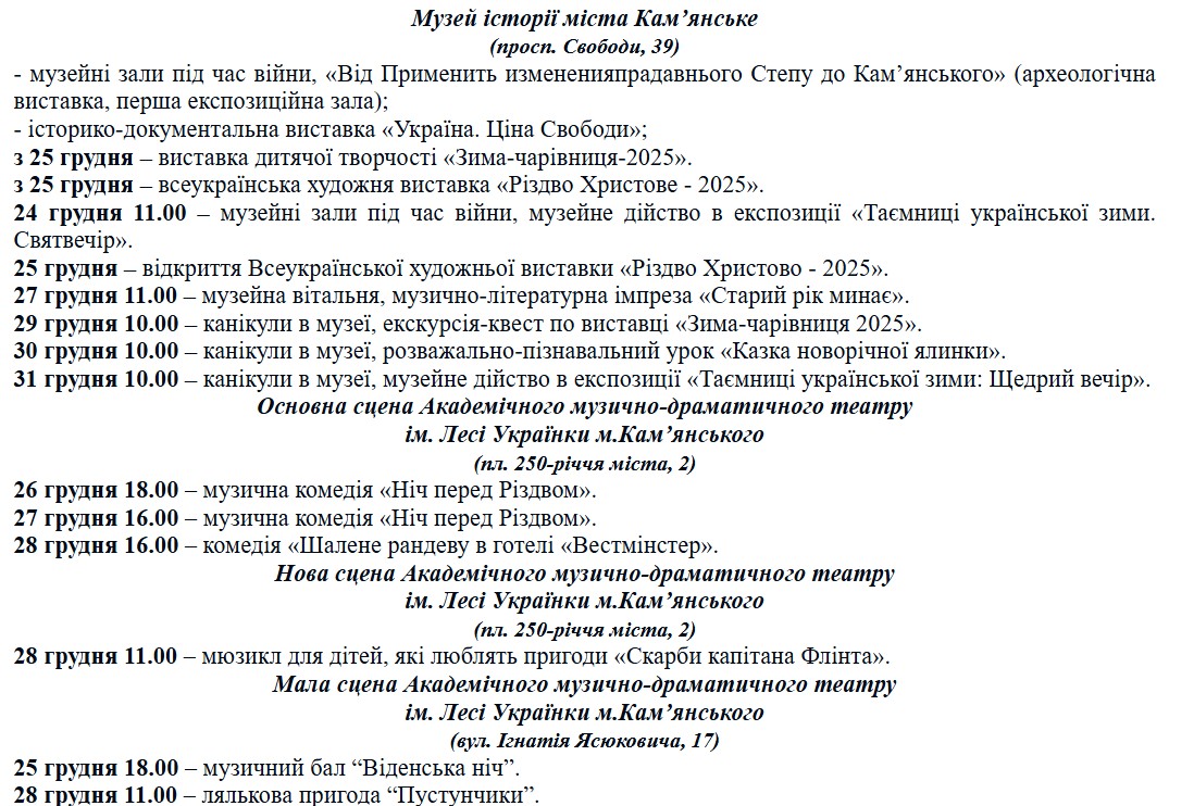 Куда пойти в Каменском: программа мероприятий с 24 по 31 декабря