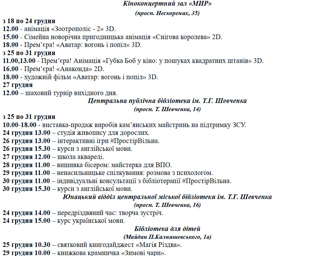 В ККЗ «МИР» покажут анимацию «Зоотрополіс-2», семейную новогоднюю приключенческую анимацию «Снігова королева», а также премьеры: «Аватар: вогонь і попіл», «Анаконда» и «Губка Боб у кіно: у пошуках квадратних штанів». В субботу состоится традиционный шахматный турнир выходного дня.